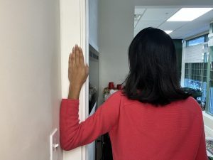 3. With the arm planted on the wall, draw your opposite shoulder back, followed by your torso in a straight line. Keep the back straight and core engaged.
